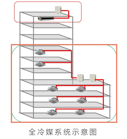 由獨立的室內機進行每個房間的冷暖處理,每臺室內機通過封閉的冷媒回路和其所在的室外機模塊進行熱量交換。因此,不管是室內側還是室外側,一套冷媒系統不但獨立且機組容量相對較小,因此被感染風險極低。新風也是由獨立的新風系統送達,可以采用帶冷熱處理的全新風機,向室內輸送新風的同時,通過門窗向外排氣,保證室內通風。也可以單個空間使用全熱交換新風系統,實現冷暖的熱量回收,滿足舒適新風的同時減少能耗。