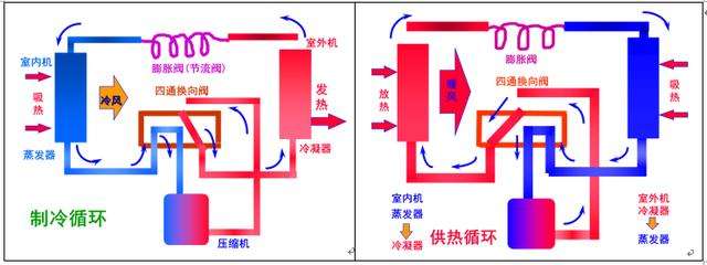 空調“制熱模式”則是相反的過程,壓縮機內氣態的制冷劑進入的是室內的交換器,變成液體,放出熱量。而空調之所以可以源源不斷地輸送“暖氣”或“冷氣”,是因為液態的制冷劑繼續通過管道流向室外的交換器,變成氣體,再進入室內,形成一個循環。